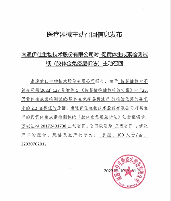 關(guān)于南通伊仕生物技術(shù)股份有限公司促黃體生成素檢測(cè)試紙(膠體金免疫層析法)產(chǎn)品的致客戶信