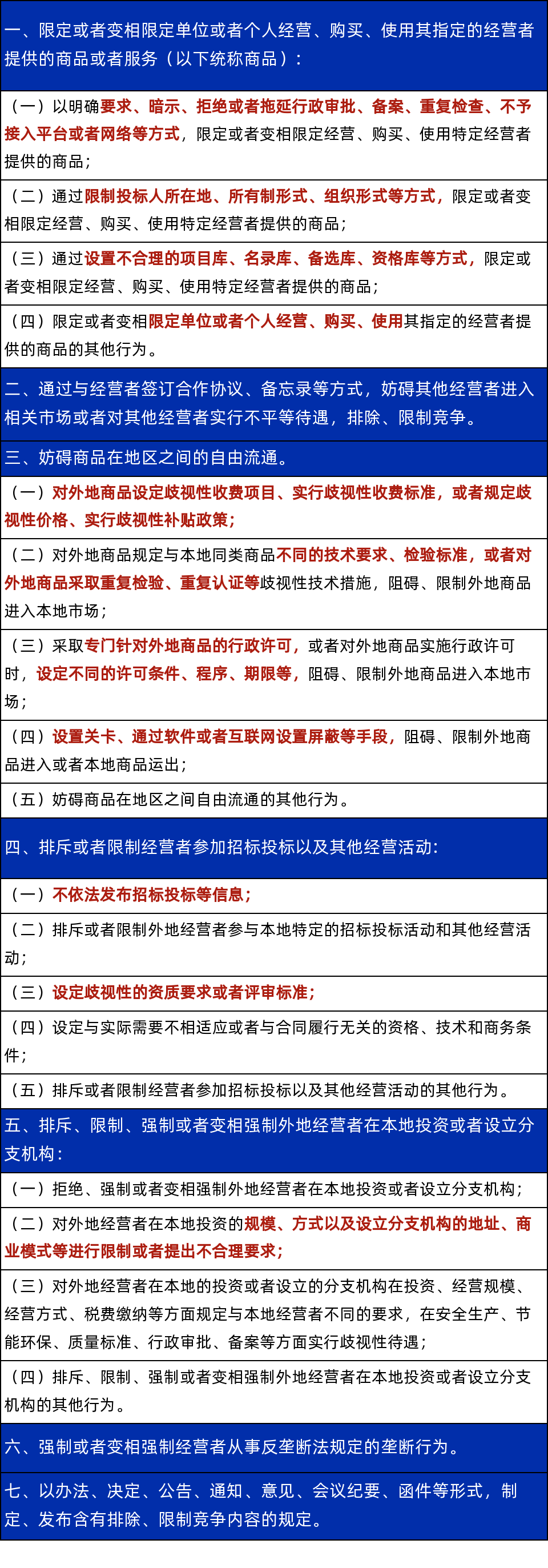 不僅如此,在此之前國家還印發(fā)了《制止濫用行政權(quán)力排除、限制競爭行為規(guī)定》,對行政機(jī)關(guān)濫用行政權(quán)力排除、限制競爭的7大類違規(guī)行為做出了明確規(guī)定: