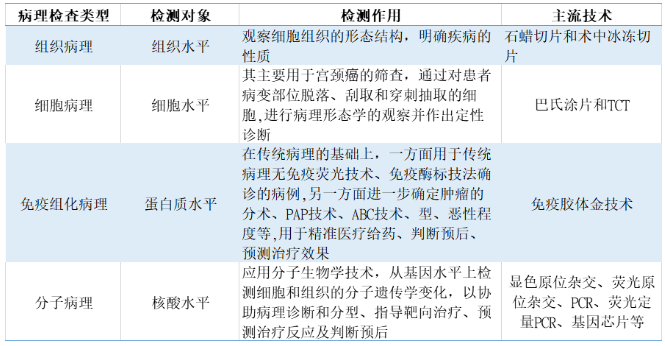 病理學(xué)根據(jù)發(fā)展階段的不同主要分為傳統(tǒng)病理技術(shù)(組織病理、細(xì)胞病理)、免疫組化病理和分子病理。傳統(tǒng)的組織病理建立在組織、細(xì)胞的水平上,可以通過病理醫(yī)師的顯微鏡診斷來判斷疾病的性質(zhì)(炎癥性病變還是腫瘤型病變、良性腫瘤還是惡性腫瘤等);免疫組化病理建立在蛋白質(zhì)水平上,可以進(jìn)一步判斷腫瘤的組織來源、原發(fā)部位、病理分型、殘留邊緣癌細(xì)胞等,除了診斷作用以外還具有指導(dǎo)預(yù)后的作用;分子病理建立在核酸分子水平上,可以確定腫瘤的基因突變類型,用于后續(xù)靶向藥物的指導(dǎo)以實現(xiàn)精準(zhǔn)醫(yī)療。