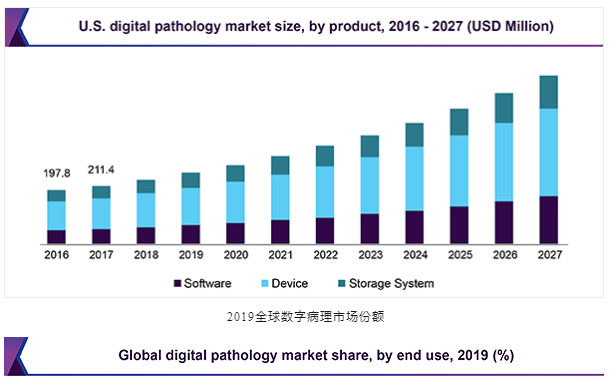 據(jù)2020年世界病理學(xué)大會報告,預(yù)計到2024年,病理學(xué)市場規(guī)模將從2019年的303億美元達(dá)到444億美元,從2019年到2024年的復(fù)合年增長率為6.1%。據(jù)GrandViewResearch預(yù)測,2019年全球數(shù)字病理學(xué)市場規(guī)模為7.676億美元,預(yù)計到2027復(fù)合年增長率為11.8%。根據(jù)最終用途,醫(yī)院在2019年占據(jù)了領(lǐng)先的市場份額。醫(yī)院采用數(shù)字掃描技術(shù)以加快診斷速度并提高患者依從性。就收入而言,2019年北美市場份額最大。