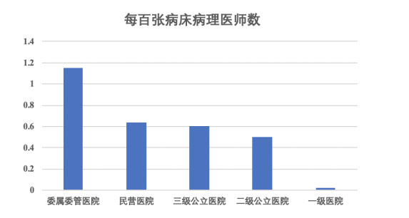 如上圖所示,其中委屬委管醫(yī)院每百張病床病理醫(yī)師數(shù)僅為1.15,三級公立醫(yī)院、二級公立醫(yī)院和民營醫(yī)院分別為0.60、0.50及0.64。根據(jù)最新發(fā)布的《2019年全國病理質(zhì)量報告》顯示,在不同級別的醫(yī)院中,全國平均每百張病床病理醫(yī)師數(shù)量為0.55,病理醫(yī)師數(shù)量奇缺的狀況沒有改善,各省、自治區(qū)、直轄市均未達(dá)到2009年《病理科建設(shè)與管理指南(試行)》(以下簡稱《指南》)的最低要求(每百張床1-2名病理醫(yī)師)。
