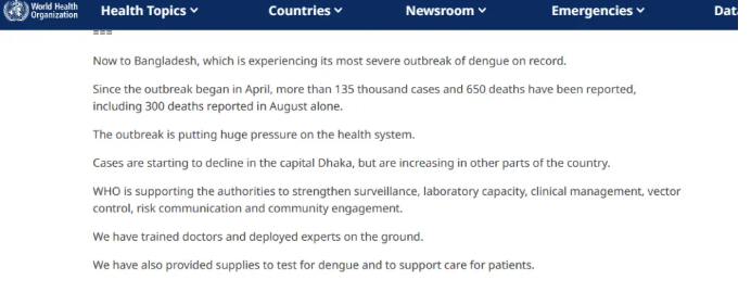 世衛(wèi)組織(WHO)周三表示,孟加拉國(guó)正在經(jīng)歷有記錄以來(lái)最嚴(yán)重的登革熱疫情,自4月份疫情爆發(fā)以來(lái),該國(guó)報(bào)告了超過(guò)13.5萬(wàn)例登革熱病例,已有650多人死亡。